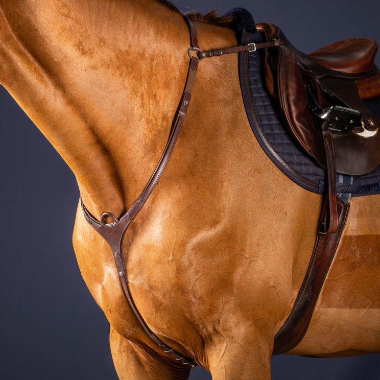 Dy'onBrustgeschirr aus der Dy'on "New English Collection". Der Steg oben am Hals ist verstellbar und sorgt für einen besseren Sitz entlang der Schultern.