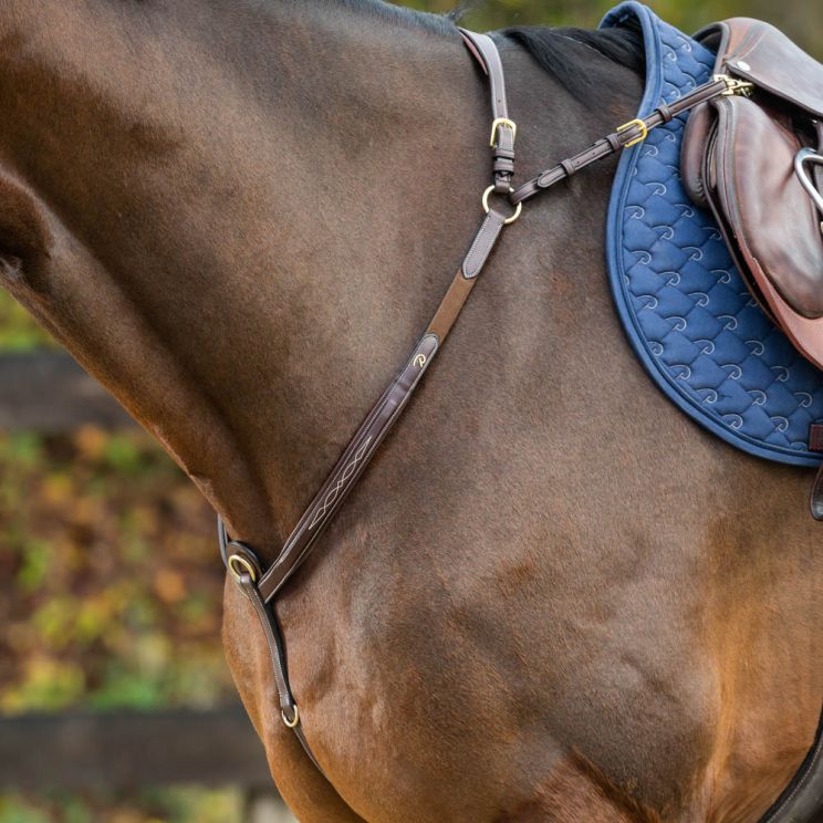 Dy'onBrustgeschirr aus der klassischen "Dy'on Collection". Das Brustgeschirr bietet eine stabile Position für Ihren Sattel und hat die Möglichkeit, eine Martingalgabel zu befestigen.