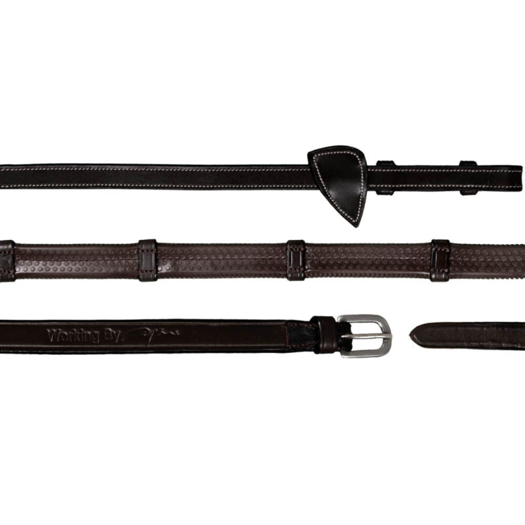 Gummizügel mit 7 Lederstegen von Dy'on aus der "Working Collection". Diese Zügel passen perfekt zu den Zäumen aus Dy'ons Working Collection.