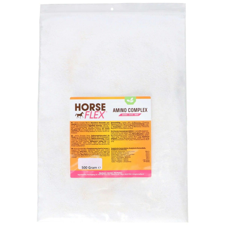 HorseFlexHorseFlex Amino Complex Stute ist eine 100% natürliche Pulvermischung, speziell auf die Ernährungsbedürfnisse von Stuten abgestimmt. Es enthält eine ausgewogene Kombination essentieller Aminosäuren wie Lysin, Methionin und Threonin, ergänzt mit Magnesiumcitrat und Hyaluronsäure.