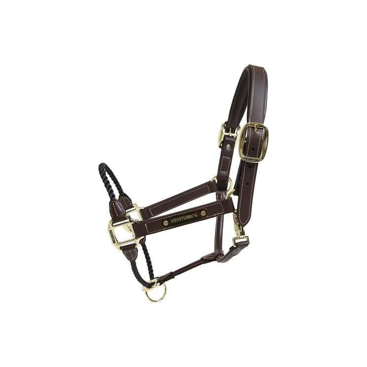 KentuckyDas Leather Rope Halfter hat einen dicken braunen Strick, um das Nasenband zu ersetzen. Dieser Strick hilft, mehr Kontrolle bei Pferden zu haben, die dazu neigen, viel Temperament zu zeigen.