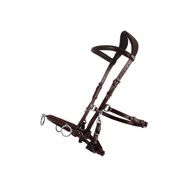 Multifunktionaler Leder-Kappzaun, der auch als Trense verwendet werden kann. Durch die abnehmbaren Bitclips kann der Kappzaum mit oder ohne Gebiss verwendet werden. Am Nasenriemen sind drei Ringe befestigt, an denen eine Longierleine befestigt werden kann. Ausgestattet mit einem anatomisch geformten Genickstück.Â